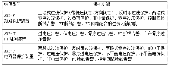 其中微机保护装置的配置遵循以下原则:进出线柜配置AM5-F线路保护装置;PT柜配置AM5-U1 PT监测装置;电容补偿柜配置AM5-C电容器保护装置。各型号主要实现的保护功能如下: